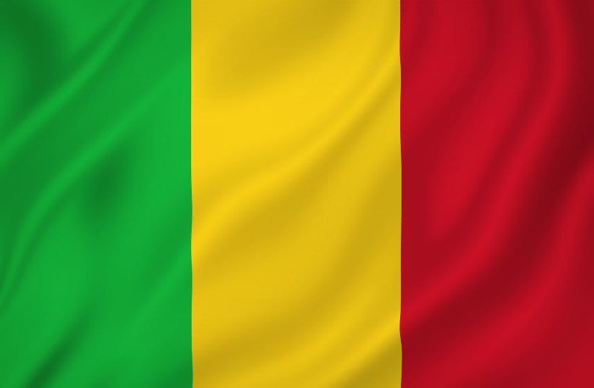 La bandiera del Mali è stata adottata il 1º marzo 1961. La bandiera è un tricolore a bande verticali, basato sul modello francese, con i tradizionali colori panafricani. Dal lato del pennone sono: verde, giallo e rosso. Il giallo, simbolo di produttività, era precedentemente caricato con la figura stilizzata di un danzatore, figura simbolica assai diffusa nel paese. Composizione: 100% Poliestere