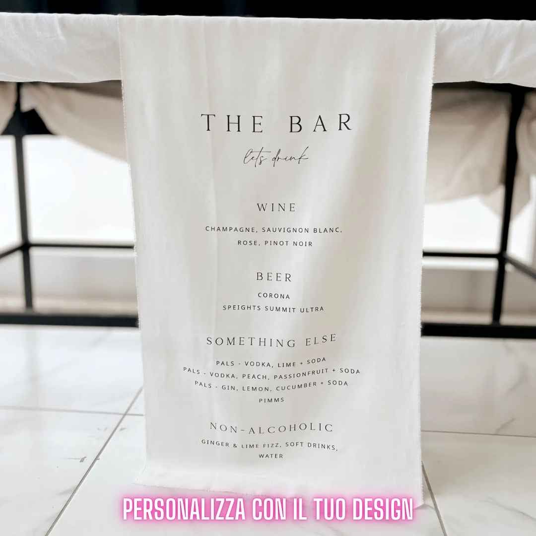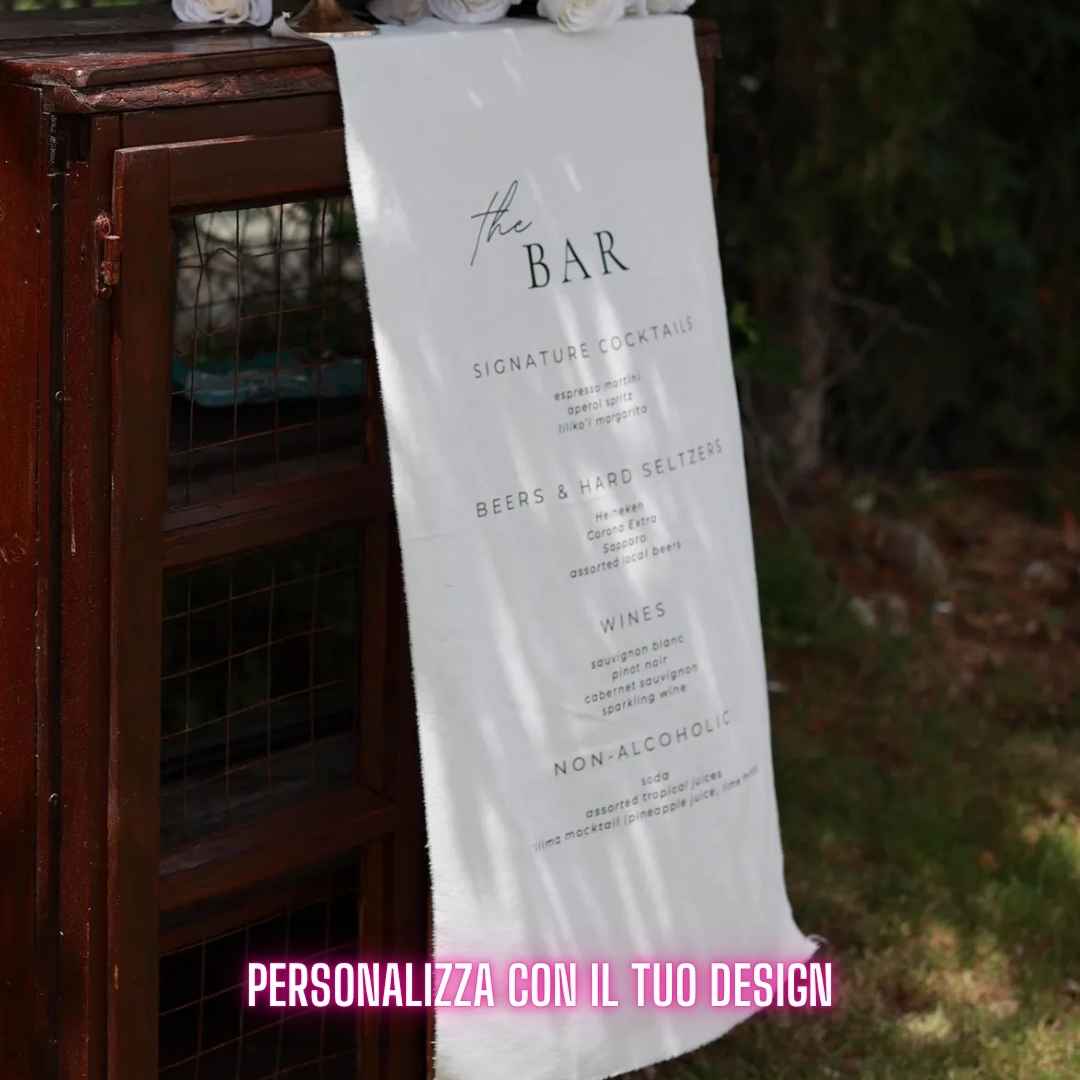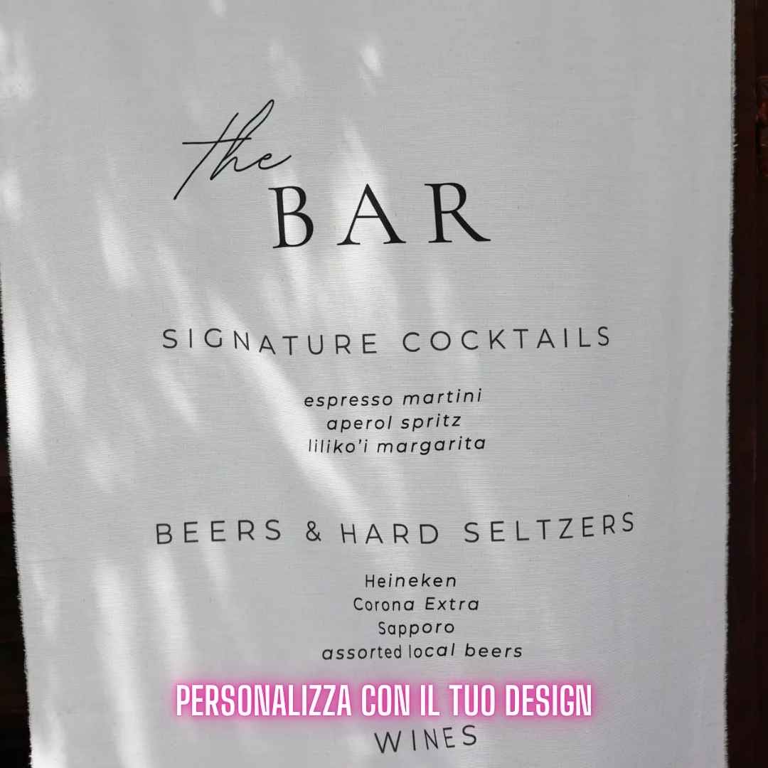 Insegna da bar con il tuo design in tessuto personalizzata, elegante e minimal. Perfetta per matrimoni ed eventi, con menù cocktail su misura e design raffinato per un tocco unico e indimenticabile.