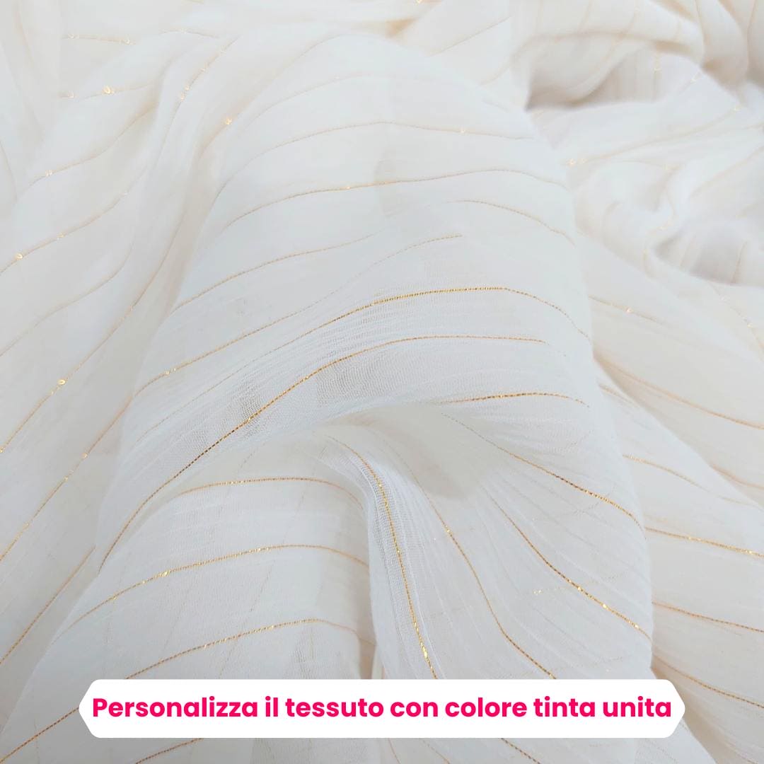 Tessuto Jersey Lurex Oro è una stoffa elastica con intreccio di fili morbida al tatto, ha come caratteristiche principali la malleabilità e la leggerezza.